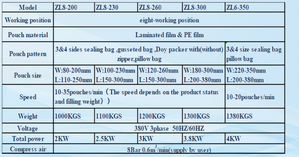 The whole machine including two sets mixing pump for soup and one set rotary bag taking filling packing machine .The main machine are control by PLC and operate by touch screen .Adopt famous Electrical accessories. High automation and easy to operate .Widely use by the different industry like Daily chemical, food, hardware and etc
