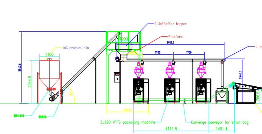 1, Samll bag ffurfio llenwi peiriant pecynnu . Mae'r rhan hon gan gynnwys y hopran deunydd crai , peiriant bwydo sgriw Incline . Hopper byffer canol , a sgriw bwydo llorweddol ar gyfer anfon yr holl ddeunydd crai i 6 set Auger peiriant measruing