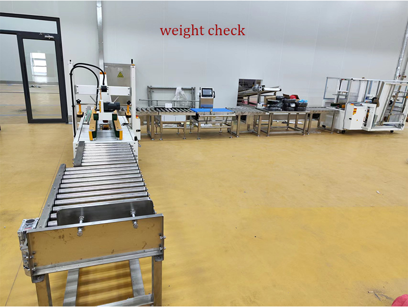 Ar ôl llenwi'r bagiau â bwyd wedi'i rewi, caiff pob bag ei ail-wirio gan synhwyrydd pwysau i sicrhau bod y pwysau'n cyfateb i'r pwysau targed, ac yna'n mynd trwy synhwyrydd metel i sicrhau nad oes unrhyw fetel yn cael ei gymysgu i bob bag. Yna caiff y bagiau eu cludo i'r llinell llenwi carton.
